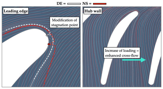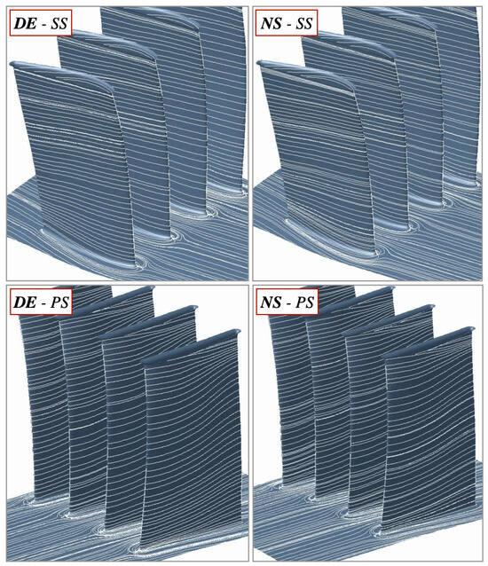 Averaged skin friction lines on the IGV surface, retrieved from URANS simulation, at DE and NS conditions on suction and pressure sides.