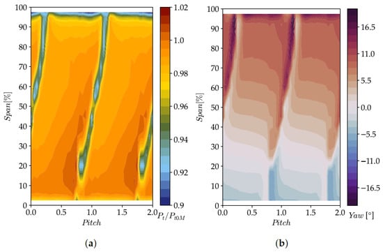 The difference between the span-wise distributions in the experiments and simulations (observable in Figure 10) is primarily due to the predicted absolute pressure values and deviation angles, the latter causing a maximum pitch-wise shift in the outlet stator wake of 7.7% relative to the experimental data. Additionally, the simulated wake is 3.5% of the pitch larger than in the experiments.