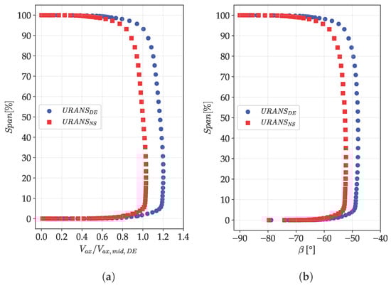 Figure 16 shows that, outside the boundary layers, the distributions remain nearly constant in the span-wise direction. However, at higher span-wise positions, a slight reduction in axial velocity is observed as a consequence of the blade action on the flow, which leads to an increase in the relative flow angle, as illustrated in Figure 16b. Additionally, moving from DE to NS, the relative flow angle at the rotor inlet increases, while the axial velocity decreases due to the change in operating conditions.