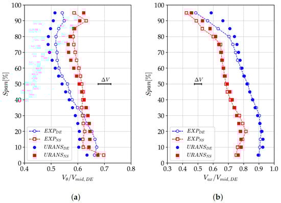 Figure 17, Figure 18 and Figure 19 present the numerical and experimental span-wise distributions of total pressure, total temperature, velocity components, and flow angles at the rotor outlet. The latter was computed within the absolute and relative frame of reference. Moreover, the velocity was decomposed into tangential () and axial () components, and normalized relative to the experimental absolute velocity measured at mid-span at the DE condition (. The highest uncertainty, computed within the 95% confidence interval across the span, is also reported.