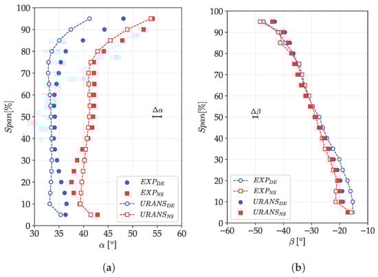 The simulations generally align well with the experimental results. However, as indicated by the performance data, the total pressure at DE condition is slightly lower than the experimental values, while showing a closer match at NS condition. Additionally, the flow angle at mid-span is accurately predicted by the URANS simulations, though a larger discrepancy is observed near the end-walls, especially close to the tip, where a maximum difference of 1.6° is found compared to the experimental results. However, it should be noted that, despite the good agreement of the simulations with the experiments, the computed uncertainty on the flow angle was found to be ±0.8°, which could hide a larger discrepancy between experiments and CFD.