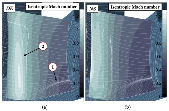 Numerical averaged skin friction lines on the stator suction side at (a) DE condition; (b) NS condition.