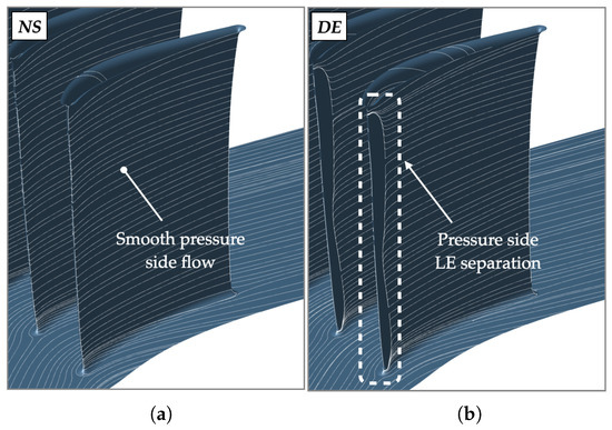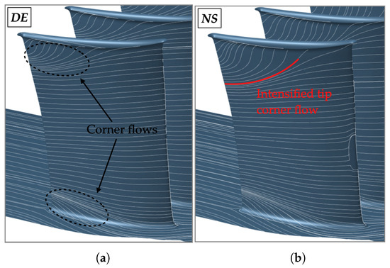 Numerical averaged skin friction lines on the stator pressure side at (a) DE condition; (b) NS condition.