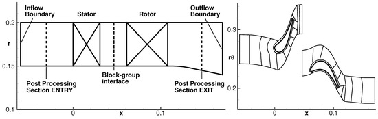 The flow solver TRACE applies a finite volume method to solve the Reynolds-averaged Navier–Stokes (RANS) equations. In this work, a two-equation k– turbulence model based on Wilcox [20] with turbomachinery specific modifications [21] was applied. The convective fluxes are discretised with an upwind-biased flux-difference splitting as proposed by Roe [22]. The extrapolation of the cell-centered state values to the cell faces is achieved with the MUSCL (monotonic upstream scheme for conservation laws) approach by van Leer [23]. Based on Fromm’s scheme [24], this approach results in a second-order accurate space discretization. The viscous terms are discretized by central differences. In the vicinity of shocks, unphysical oscillations are prevented by a modified van Albada limiter [25]. The turbulent boundary layers in the vicinity of the stator vanes and rotor blades are resolved by the meshes (). At the duct walls, the meshes are coarser and the boundary layers are modelled relying on the “law of the wall” by Spalding [26]. There, the non-dimensional wall distance verifies . For the URANS simulation, an implicit backward-difference formula time integration scheme of second-order accuracy [27] was applied, while a fully conservative zonal approach allows for the coupling of the stationary and the moving blade rows (Yang et al. [28,29]). Two-dimensional non-reflecting boundary conditions are used at the inflow and outflow boundaries [30] for both URANS and HB calculations. In the HB calculations, a 2D Giles boundary condition is also used at the interface between the stator and the rotor. The system of equations in the HB calculations is solved with a pseudo-time marching method.