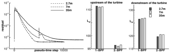 Those discrepancies are partly related to the different numerical methods. For instance, the number of harmonics being accounted for in the HB method is usually restricted. In this paper, only four harmonics are considered in the HB calculations. Another explanation is the convergence of the phase-lag method. This method works much better in combination with the HB method, because it is formulated in the frequency domain. A convergence study based on the modal sound power spectra obtained with the XTPP method has shown that for the HB calculation the variation for every individual mode is below dB after 5000 and 10,000 iterations. The convergence for the URANS calculation is less good. After 20,000 and 25,000 time steps, the sound power summed up per frequency still varies by about 0.1 dB for 1 × BPF and by about 0.6 dB for 2 × BPF. For the individual modes, the differences are significantly larger: below dB at 1 × BPF and up to 10 dB at 2 × BPF. A third reason for the differences between the two calculations might be due to the non-reflecting boundary conditions. They also perform better in the HB calculation. Table 2 shows the difference between waves propagating toward the boundaries and those backward reflected. The reflections are much stronger in the URANS calculation, especially downstream of the turbine.