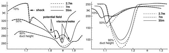 In addition to the variation of the streak temperature amplitude and the streak diameter, Figure 10 also shows results for a variation of the streak radial and azimuthal position. The radial position was also investigated at 20% and 80% of the duct height (using a streak diameter of m) and the azimuthal position was changed to rad (with m). There the streak hits a stator leading edge, is divided in two and convected on both sides of the stator vane. These two parameters also appear to have a significant effect on noise. The sound power of the additional modes can increase by 5 to 10 dB due to those changes. The variation obtained by changing the streak radial position might be related to the variation of the mean flow Mach number in the rotor. Furthermore, the streaks might be moved to more or less acoustic effective positions when their radial position is changed. The streak azimuthal position defines whether the stator passage flow is affected or the flow in the vicinity of the vane. In contrast to Figure 7, the velocity field in the passage flow downstream of the stator appears unchanged, but the velocity deficit in the stator wake is significantly reduced (by about 27% of its depth) when the streak hits the stator.