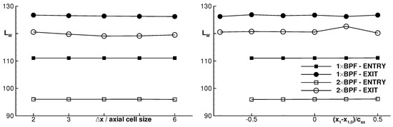 The results applied to the HB solution are shown in Figure 4. The sound powers of all waves propagating away from the turbine are summed up for each frequency. Reflections back towards the turbine are significantly smaller and are not shown for the sake of clarity. In the inlet, the analysis method is very robust: the variations in sound power levels are less than 0.2 dB. In the exit section of the turbine, the variations are larger but still satisfactory: smaller than 1 dB for 1×BPF and 2 dB for 2×BPF. The higher discrepancies measured on the downstream side of the turbine have two main reasons: firstly, the mean flow strongly differs from the uniform-flow assumption applied to determine the eigenmodes; secondly, the variation in the duct geometry and as a consequence in the mean flow are in conflict with the slowly varying duct assumption, which does not allow any mode to become cut-on in the analysis section. According to this study for 2×BPF, the mode (−16,3) changes from cut-off to cut-on at some position between and 0.5. This strongly affects the level of the mode (−16,2). At the analysis position , that mode is higher by about 10 dB and thereby the sum over all modes is increased by about 2 dB compared to the rest.