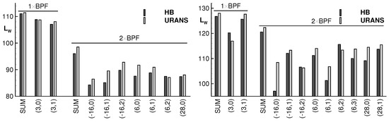 The acoustic results are summarised in Figure 5, where the sound power level is represented in total and per mode for each frequency. The azimuthal mode orders excited by the turbine at the k-th harmonic of the blade passing frequency are given by [38]. The total sound power found in each frequency tends to be smaller in the HB calculation than in the URANS calculation. Upstream of the turbine, it is smaller by about 0.4 dB and 2.5 dB and downstream by about 1.3 dB and 1.8 dB, respectively, for the fundamental BPF and its first harmonic. For individual modes, the discrepancy can be significantly larger, reaching up to 10 dB.