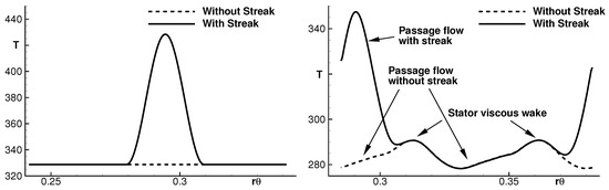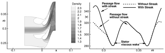(left) Density in the steady flow solution in the stator passage at 50% duct height and (right) mean velocity amplitude at the stator exit with and without streaks at about 41% duct height.