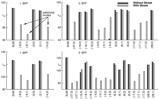 Figure 8 shows the modal sound power spectra for 1 × BPF and 2 × BPF and the total sound power level per frequency for the modes propagating away from the turbine. Clearly there are additional mode orders present in the acoustic field as a consequence of the streaks. The mode orders satisfy Equation (2): at 1 × BPF the new modes are at and 14, and at 2 × BPF , , and 17. Those additional acoustic modes transport significantly less power (≈−20 dB) than the modes whose azimuthal orders correspond to the original stator–rotor interaction. Table 3 gives the sound power of the additional and original modes. For the simulation without streaks, the acoustic sound power found in the additional modes is due to numerical noise in the simulation. The signal-to-noise ratio given by the simulation without streaks is about 50 dB, which provides confidence that the relatively small sound power found in the additional modes in the simulation with streak is physical. The comparison between both simulations also shows a minimal decrease of the sound power due to the streaks for the modes corresponding to the original stator–rotor interaction, which is also apparent in the integrated sound power level. This reduction is about 0.5 dB and 1.3 dB upstream of the turbine and about 0.8 dB and 0.2 dB downstream. It might be worth mentioning that this reduction is noticeable for most but not all individual modes. For instance, downstream of the turbine the amplitude of the mode increases with the streaks (see Figure 8 bottom right).
