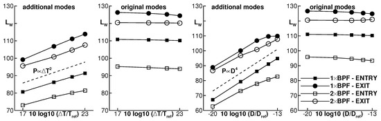 In the following, two parameter variations are presented. In the first study, the streak temperature is varied from to 200 K in 50 K steps while the streak diameter remains unchanged ( m). In the second study, the streak diameter is varied from to 0.05 m (100% duct height) in 0.01 m steps with a constant temperature amplitude K. Figure 9 shows among others the sound power level of the additional modes coming from the streaks. The amplitude evolution seems to follow a simple scaling law of the type: