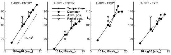 Detailed values of are given in Table 5 together with the coefficients of determination. With being in the range from 1.4 to 3.1, these results are similar to what is proposed by Marble and Candel [3]. In that one-dimensional theory on sound waves generated by the convection of entropy spots through a sub-sonic nozzle, the sound pressure amplitude is directly proportional to the entropy fluctuation, and thus the sound power is proportional to the entropy fluctuation squared. This similarity between theory and the numerical results regarding the relationship between entropy disturbance and sound power might indicate that the additional acoustic modes could be due to entropy noise. However, there is no certainty for this source mechanism being dominant concerning the additional modes in the presented simulations, because the streaks during their convection through the stator also modify the velocity field as shown before in Figure 7. The force-induced sound sources on the rotor surface resulting from the interaction of the velocity field with the rotor could be important and dominant, too.