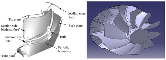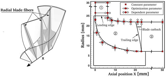 The parametrization is one of the crucial steps in every optimization process. On the one hand, the design space should be diverse and large enough in order to include optimal designs; on the other hand, geometric restrictions are invariably imposed due to mechanical and manufacturing limitations. In particular, turbocharger radial turbines have to withstand the harsh environment of high mechanical stresses at high temperatures. Therefore, as illustrated in Figure 2 (left), radial turbines are commonly designed with radial fibered blades in order to avoid bending stresses inside the blades due to centrifugal forces.