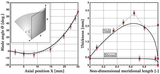Blade angle parameterization (left); blade thickness distribution at hub and shroud (right).