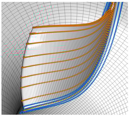 The aforementioned procedure generates the turbine wheel geometry defined by several NURBS, which is shown in Figure 4 for the surfaces of the blade and the hub fillet along with their control points. The blade surfaces are skinned through ten sections in span-wise direction, whereas the hub fillet surfaces are generated by a rolling-ball algorithm involving several CAD operations such as surface intersection, surface off-setting, trimming, and surface lofting [36]. The endwalls at both hub and shroud are axisymmetric surfaces revolved about the x-axis. Using the displacements of the control points shown in Figure 4 directly as optimization parameters would result in a much larger design space as compared to the approach followed in the present work. However, this would require imposing many constraints to ensure a minimum blade thickness as well as geometric continuity at the junction between the fillet and the adjoining surfaces. Furthermore, avoiding bending stresses in the blade due to centrifugal forces requires an equal mass distribution on both sides of the radial fiber at each cross-section along the machine axis (cf. Figure 2, left). In particular, the last requirement would be difficult to realize, while it is inherently satisfied by the approach presented in this paper.