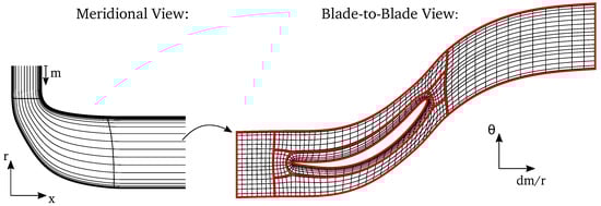 In general, the automatic grid generation process consists of a two-step approach that is illustrated in Figure 6: first, the meridional passage is discretized by a predefined grid point distribution with a boundary layer refinement towards the endwalls at hub and shroud. Each meridional grid line is consecutively converted into a surface of revolution, which is intersected with the blade pressure- and suction-side surfaces. Angle-preserving conformal mapping [38] is used to transform the ()-coordinates of the intersected blade profile on the surface of revolution into an equivalent two-dimensional ()-space (cf. Figure 6, right) and vice versa. Secondly, the two-dimensional body-conformal grids are created by elliptic grid generation [39] by solving the elliptic equations