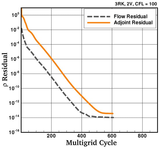 The differentiated nonlinear residual (), which is a large and sparse matrix, is not explicitly stored in memory but directly multiplied element-by-element with the adjoint vector . This approach has two main advantages: first, the resulting memory footprint of the adjoint solver is similar to the primal flow solver, which is largely determined by the system matrix , while the run-time of the adjoint solver is equivalent to the primal flow solver. Secondly, since the transposed system matrix has the same eigenspectra as , the adjoint solver inherits the convergence rate of the flow solver [50,52,53], which is illustrated in Figure 8 for a radial turbine test case. This is a desirable property as it guarantees convergence of the adjoint problem, provided that primal flow solver converges (i.e., the system matrix at the last iteration of the flow solver is contractive with the magnitude of all eigenvalues less than unity).