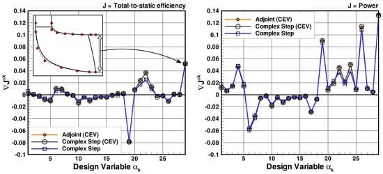 The adjoint-based gradients are validated against exact gradients where the complex-step method is applied to the entire evaluation chain. This is illustrated in Figure 9 showing non-dimensional design gradients of total-to-static efficiency (left) and power (right). Additionally, to quantify the error introduced by the CEV assumption in the adjoint solver, two sets of complex-step gradients are plotted: one where the same approximation is made as in the adjoint solver (circle symbols) and one that provides exact gradients without any approximation (square symbols). As can be seen, both the sign and the magnitude of the adjoint-based gradients agree well with the complex-step gradients using the CEV assumption. For example, the gradient of design variable 29, which is the exit width, suggests that both the efficiency and power increase when enlarging the exit area. The CEV assumption indeed affects the accuracy of the adjoint-based gradients, in particular for design parameters of the shroud meridional contour (design variables 21–24), where this assumption may not be valid due to the tip leakage vortex. However, they are accurate enough for shape optimization as will be shown in Section 4.