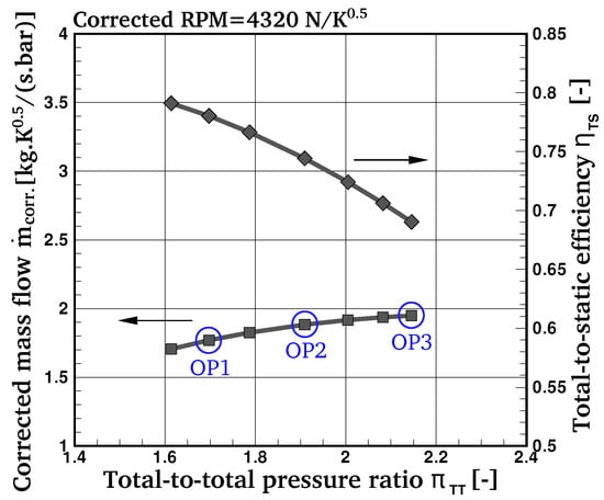 The objective of this study is to improve to total-to-static efficiency of the radial turbine at two operating points while constraining the output power at these conditions and ensuring a sufficient swallowing capacity of the machine at high mass flow rate. The operating points are indicated in the performance map of the turbine in Figure 10 and the corresponding boundary conditions are listed in Table 1.