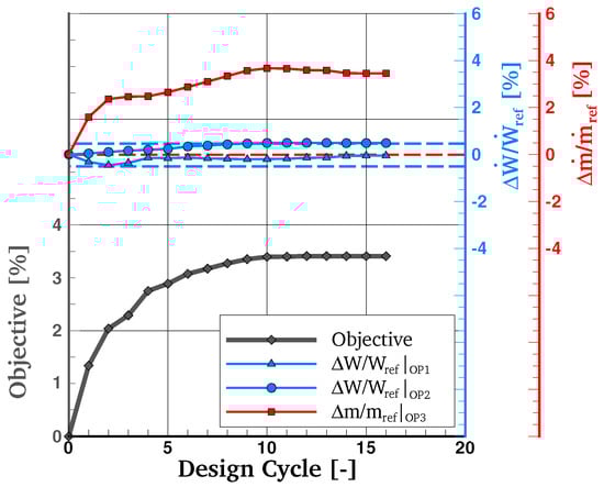 The optimization converged in 16 design cycles after which no further improvement of the objective could be found by the algorithm while satisfying the imposed constraints. This translates to a run-time of approximately 1.5 days on a multicore workstation using an Intel® Xeon® E5-2690 processor with 2.6 GHz CPU rate. Figure 11 shows the evolution of the weighted objective function as well as the power and mass flow constraints. Each design cycle comprises three flow solutions to compute the objective and the constraints at different operating points and five adjoint solutions: two, respectively, for the total-to-static efficiency and power functional, and one for the mass flow constraint. For the sake of clarity, sub-iterations in which a derivative-free line search was performed to estimate a step size for solving the optimization problem are not included in this plot. In total, the optimizer could improve the objective by approximately 3.4% relative to the baseline geometry already after ten design cycles with minor improvements in the following iterations. As can be seen, the mass flow constraint was not restricting the design progress and the computed mass flow rate at operating point OP3 always exceeds the reference value and therefore satisfies this requirement. The power constraint, on the other hand, was indeed a limiting factor in this optimization. In particular, the power constraint at operating point OP2 was active and reached the upper limit of the imposed bounds. This agrees with the reasoning made in Section 3 that both efficiency and power increase due to the lower total temperature ratio through the machine. However, the optimizer was able to improve the turbine total-to-static efficiency and simultaneously comply with this strict design requirement. Although the turbine geometry undergoes significant changes during the optimization process, each design maintains smooth blade shapes, axi-symmetric endwalls, and is satisfying the geometric constraints due to the CAD-based parameterization as will be shown in the following.