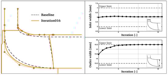 Comparison of the meridional contour of the baseline and optimized geometry (left). Evolution of inlet and outlet width during the optimization process (right).