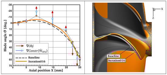 Figure 13 (left) shows the modification of the blade angle -distribution between the baseline and the optimized geometry with the corresponding blade shapes on the right-hand side. Here, the design changes are less intuitive to judge because the -angle distribution defines the angular coordinate of the blade with respect to the meridional plane and is therefore not related to the blade metal angle, and hence the relative flow angle. However, the design gradients of the underlying set of control points, which are included in Figure 13 (left), provide better insight into the design problem. Each arrow in this plot indicates the gradient magnitude and direction to higher objective function values (red with filled head) and increased power at operating point OP2 (blue with hollow head). As can be seen, for every design parameter, the respective pair of gradients is pointing in the same direction, which again shows that higher total-to-static efficiency and increased output power are closely related (cf. Section 3). In an unconstrained optimization problem, the blade would be altered until the objective design gradients eventually approach zero. In the present study, however, the power constraint at operating point OP2 has reached its maximum tolerated value (cf. Figure 11) and consequently the blade shape is not further modified by the optimization program in order to fulfill this design requirement.