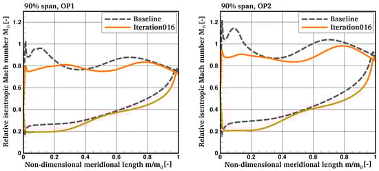 Relative isentropic Mach number on the blade surface at 90% span of the baseline and the optimized geometry (Iteration016) at operating point OP1 (left) and OP2 (right).