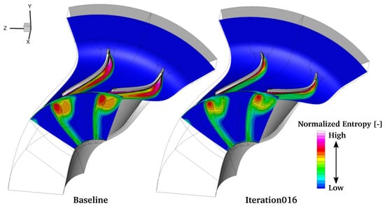 Comparison of normalized entropy at 90% span of the baseline and the optimized geometry (Iteration016) at operating point OP1.