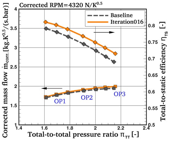 Performance map of the baseline turbine wheel and the optimized geometry (Iteration016).