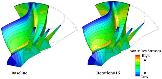 Comparison of von Mises stresses in the baseline and the optimized turbine wheel (Iteration016).