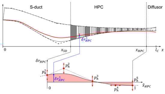 The biggest influence on finding a valid compressor geometry can be attributed to design parameters effecting the inner and outer annulus contour represented by two B-spline curves. They are based on a reference compressor contour, which, in a first design step, is scaled to the inlet and outlet of the actual compressor, and then the scaled control points are additionally modified within user-defined margins by the optimizer, see, e.g., lower annulus contour in Figure 1. To ensure the highest possible level of flexibility independently of the number of control points used for the contour lines, their variation is controlled by separate perturbation splines for hub () and tip () with a constant number of control points being lower than those of the reference contour. An example for such an HPC hub section perturbation spline is given in the lower part of Figure 1. Control points of the annulus splines are not modified directly by the optimizer, but rather by changes of the perturbation splines whose control points are actively modified as part of the design vector in Equation (2). In order to reduce the dimension of the design space, perturbation information is only applied in radial direction by of the hub control points, where axial variations may be applied analogously if more general modifications of the compressor geometry are desired.
