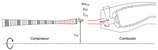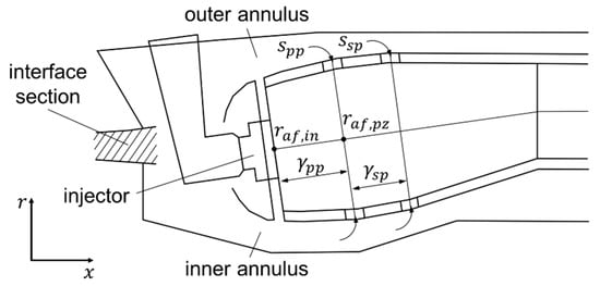 Only with such an embedded compressor calculation taking S-duct and diffusor into account, the relevant compressor interface values at the diffusor exit position can be determined properly. Relevant interface parameters between compressor and the downstream combustor component are exit flow angle , exit flow Mach number , exit temperature , and exit pressure summarized in coupling vector ; see also Figure 2. They result from the compressor flow analysis, which is why their compliance with combustor specifications cannot be guaranteed in advance, but must be enforced during the optimization process. This can be achieved either in a classical way by equating them with prescribed values from the performance calculation, or by using them as flexible interface variables in a global engine optimization problem as proposed in Section 4. The same applies to the geometric parameters in Figure 2, which have to be identical for both components (i.e., compressor exit and combustor inlet).