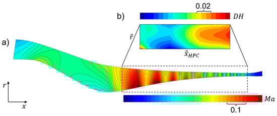 Axisymmetric meridional flow field of an optimized compressor geometry predicted by Throughflow: (a) absolute Mach number contour plot and (b) de Haller criterion for the bladed part with respect to normalized axial and radial coordinates.