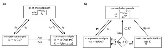 Two different solution strategies for coupling the two engine components will be investigated. The first design approach is an all-at-once strategy, in which both component design processes are integrated into a single optimization process and all design parameters are managed simultaneously by the overall optimizer, Figure 6a. The sub-processes are executed sequentially, where the upstream compressor component is executed first to determine the input parameters and for the subsequent combustor component. Due to prediction limitations of the involved design tools, upstream coupling effects from the combustor onto the compressor, such as the pressure increase in the combustor dump region, are neglected here. However, if the design process is extended by higher-fidelity design tools, upstream flow information should be considered and evaluated as well. After execution of both analyses, the results are returned to the optimizer. The global design problem formulation combines Equations (2) and (5) and represents a multi-criterion optimization problem [] with design parameters and constraint functions . However, to reduce the number of global objectives, the component efficiencies are combined. For the present chained compressor-combustor system, the efficiency values may be multiplied to receive the overall efficiency . This leads to the bi-criterion optimization problem