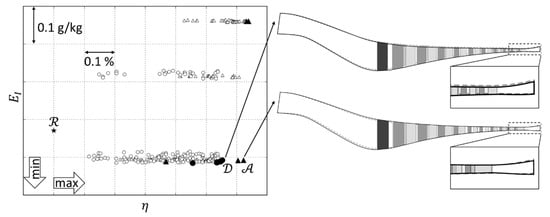 As can be seen in Figure 7, both holistic optimization strategies yield non-dominated solutions (represented by black triangles and circles), which are better in both criteria compared to the reference design obtained from isolated compressor optimization. However, also differences between the all-at-once approach and the decoupled strategy are visible: Although shown results are not representative and may change for another search due to the random nature of evolutionary algorithms, it is interesting that the all-at-once optimization is able to identify the disconnected Pareto-front. The discontinuities, in particular for the emission index, are due to the binary character of the discrete port style parameters and . If the first mixing port style, i.e., for primary zone, is set to plain and the secondary to chuted, lowest emissions are obtained. Compared to this, the two optimal configurations of the all-at-once optimization with high emissions do have chuted port styles only. Reasons why the decoupled strategy converged into the feasible design space with plain mixing ports only are (i) low number of function evaluations for each individual combustor optimization, (ii) better global search properties of the AMGA compared to the local CMA-ES based combustor optimization, and (iii) an early convergence of the top level optimization since combustor optimizations are only executed for feasible compressor designs. The results of Figure 7 have been confirmed in several runs, whereby the obtained representations of the Pareto-fronts are not exactly identical due to the utilization of evolutionary optimization algorithms. Further investigations are required to gain more confidence, and a multi-objective treatment of discrete variables as proposed in [] may be applied to prevent premature convergence.
