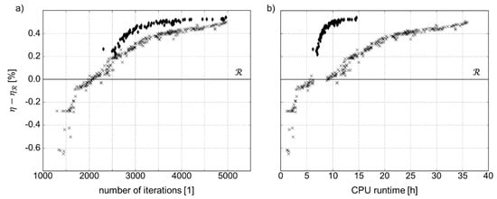 Feasible designs for all-at-once optimization (diamonds) and decoupled optimization (crosses) in comparison to reference design () for first 5000 runs for (a) efficiency vs. number of iterations and (b) efficiency vs. CPU time.