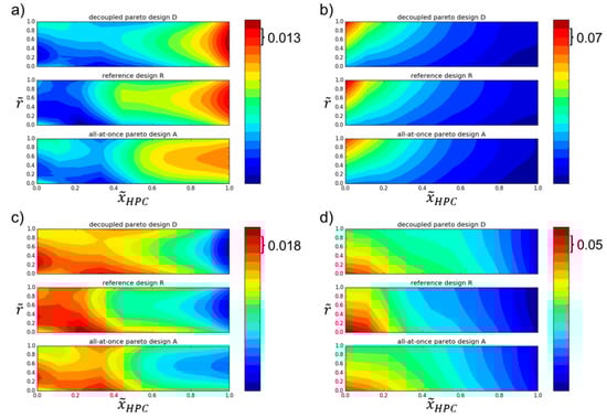 In Figure 7, annulus geometries for design representing a non-dominated solution with low emissions from the all-at-once strategy, and tradeoff design from the decoupled approach corresponding to designs with low emission and maximal efficiency, are shown and compared to the reference design . For all three configurations (, , ), similar overall design requirements like overall compressor pressure ratio, shaft speed, environmental conditions, etc., have been used. As can be seen, the annulus outline for both designs and deviates from the reference design . While the cross section area of design increases, especially in the S-duct section and the first stages of the bladed part, the annulus contour of design is located on a lower mean radius with similar cross section areas.