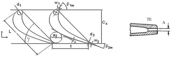 Basic geometric parameters of cascade. TE, trailing edge; Δ, width; L, true chord length; d2, trailing edge thickness; d1, leading edge diameter; w2, trailing edge wedge angle; w1, leading edge wedge angle; β1m, intel metal angle; β2m, outlet metal angle; Cx, axial chord length; t, pitch; δ, unguided turning angle or uncovered turning; a2, throat width; γ, stagger angle