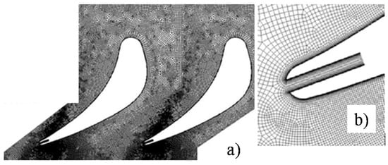 The numerical simulations were performed using the commercial solver Fluent (ANSYS, Canonsburg, PA, US). Calculations were conducted over a period of several years, so different versions of Fluent were used. In most cases Fluent version 14.5 (ANSYS) was used. The calculations are done at the mid span, and the flow is assumed to be 2D and periodic in a spanwise direction. The unstructured numerical mesh was generated using the commercial code Gambit. Figure 3a shows this mesh, which contains 50,000 cells. The mesh is stretched within the boundary layer according to the exponential law, and the value of the numerical accuracy criterium (y+) in the first cell on the wall is below 1. The mesh behind the trailing edge is also refined to resolve the shocks at supersonic exit conditions.