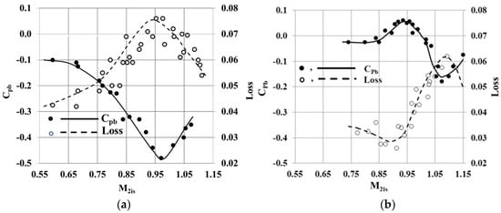 Measured losses (Loss) and base pressure coefficient (Cpb). (a) Cascade 1 with δ = 2.3°; (b) Cascade 4 with δ = 15.9°. Symbols are measured values, curves—trend lines.
