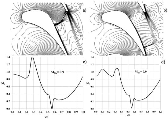 Comparison of calculated flow structure in variants 1 and 4 at M2is = 0.9 (a) isolines of M = const in Cascade 1; (b) isolines of M = const in Cascade 4; (c) isentropic Mach number distribution in Cascade 1; (d) isentropic Mach number distribution in Cascade 4.