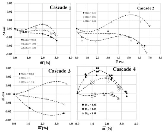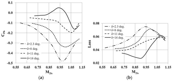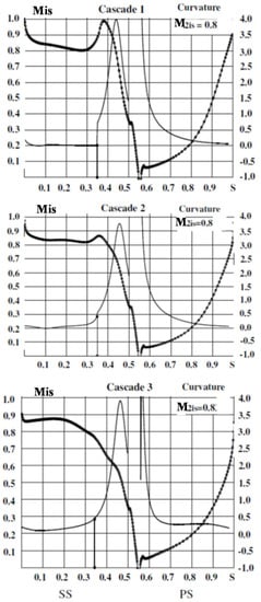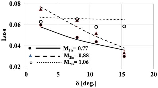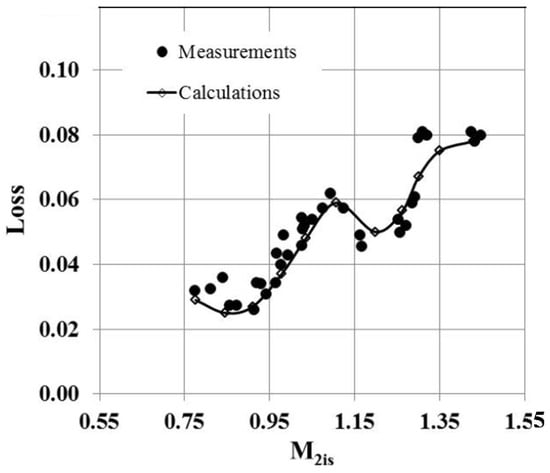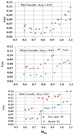 Figure 9 shows measured profile losses in Tip, Mean, and Hub cascades in the wide range of the exit Mach number M2is = 0.57–1.12. In general, experimental investigations showed that the profile losses in cascades with round trailing edges are lower than the profile losses in cascades with the blunt trailing edges.
