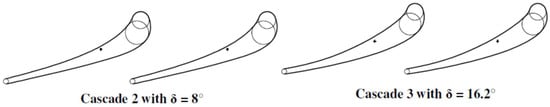 Two additional cascades have been generated using the same basic geometric parameters but with higher unguided turning angles. The main geometry parameters of these cascades are presented in Table 3 and a view of these geometries are shown in Figure 11.