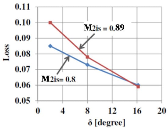 Figure 13 shows computed profile losses over the unguided turning angle δ range from 2° to 16.2° for two values of the exit Mach number, M2is = 0.8 and M2is = 0.89. This plot shows that the profile losses in the Vane with thick and blunt trailing edge (d2/a2 = 0.2) are decreased by 3.5–4% with an increase of the unguided turning angle from δ = 2° to δ = 16.2°.