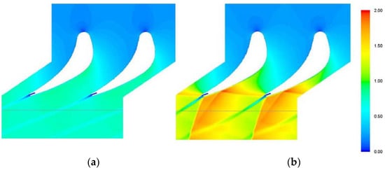Flow structure in Cascade 4 in cold flow conditions: (a) subsonic exit flow M2is = 0.78; (b) supersonic exit flow M2is = 1.43.