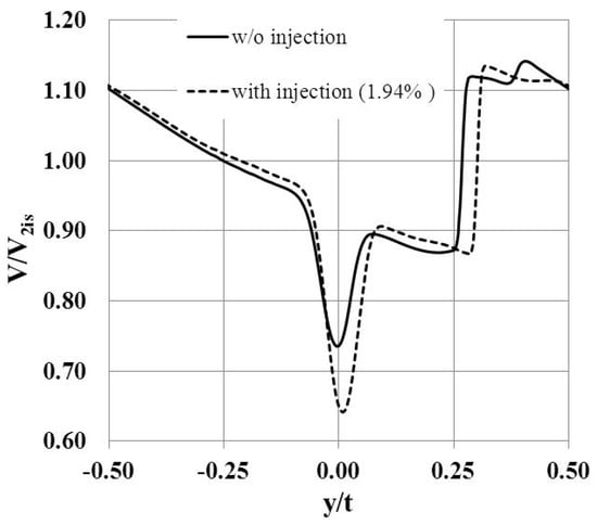 The flow velocity distribution across the wake, presented in Figure 19, shows that the coolant injection into the wake increases the width of the wake and reduces the velocity maximum within the wake as compared to the case without coolant injection. This results in a change of losses. Moreover, the coolant injection can change both the shock position and its intensity and this can affect the loss as well.