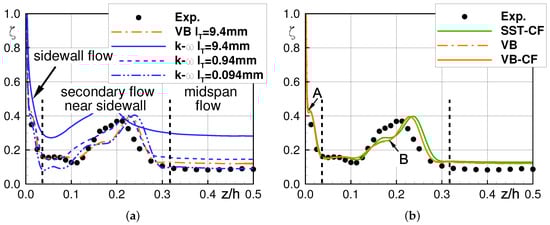 For evaluation purposes, numerical results of the pitchwise averaged spanwise distribution () of the total pressure loss coefficient are shown and compared against experimental results [] in Figure 1.