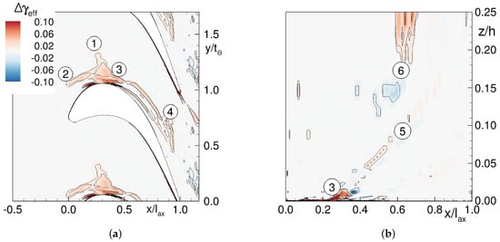 In Figure 2a,b differences between numerical results for predicted with VB-CF and VB are plotted to show the effect of the cross-flow extension to the transition model on the boundary layer behavior on the sidewall and suction surface. The extended transition model leads to a stronger prediction of the suction-side ② and pressure-side ① leg of the horseshoe vortex and hence, in combination to a stronger impingement on the suction side at ③. In addition to that, the separation line of the formed passage vortex on the sidewall ④ is also more strongly predicted. The impingement on the suction side ③ is also seen on the suction side plot in Figure 2b where the numerically predicted intermittency is also more pronounced. This is also true for the separation or lift-off line of the horseshoe vortex of the suction surface ⑤. Some minor differences on the suction surface may be identified near the laminar turbulent transition zone ⑥.
