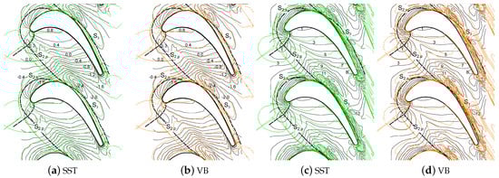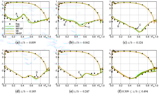 Additionally to the former investigations, both model combinations (VB and SST together with the original -ReΘ) are also extended with the cross-flow extension (VB-CF and SST-CF) indicating just small (below 1%) local differences (Figure 3a region A). Starting at midspan in Figure 3f, all combinations show a good prediction compared to experimental data. This holds for the next spanwise position in Figure 3e where the VB model gives perhaps a paper-thin better result than the SST (Figure 3e region E). This is more pronounced in regions D and C (in Figure 3c,d, respectively) coming closer to the sidewall where the interaction between the secondary flow and the suction side is stronger in Figure 3c,d. Closest to the wall at and 0.009 the favorable prediction with the VB is still present except for region C in Figure 3b.