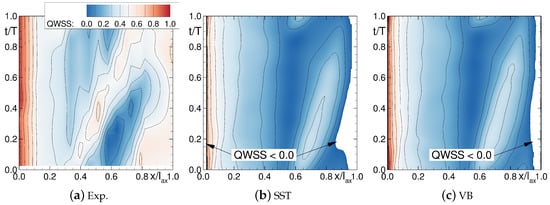 The reason for the improved prediction of the efficiency of near choke can be seen in Figure 7. From the space-time diagrams of the QWSS gained from the experimental data (Figure 7a), it is clear that the vane experiences a laminar flow, which is alternately disturbed by a wake. The QWSS shows high values in the laminar region shortly downstream of the leading edge, which decrease to smaller values further downstream. The laminar flow is periodically disturbed by a wake, characterized by higher QWSS due to the higher turbulence intensity. At the flow on the suction side is turbulent, because QWSS always shows a high value due to the higher turbulent viscosity relative to the laminar viscosity. A similar behavior can be seen in the space-time diagrams of the SST in Figure 7b and VB simulation in Figure 7c. Nevertheless, the numerical predicted wake seems to impinge on the suction side further downstream at and an open separation is predicted by both the SST and VB simulation. In spite of these differences, the extent of the wake-induced transition region predicted by VB is in better agreement with the experimental data. This leads to an increase in turbulent losses, a reduction of the isentropic-to-mechanical efficiency and, therefore, to a better agreement with the experimental data.